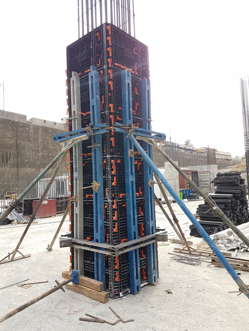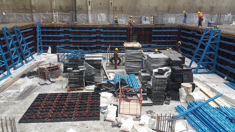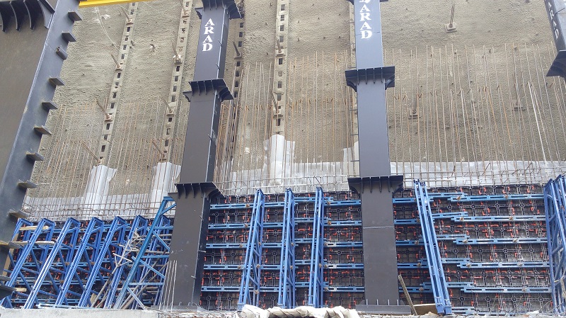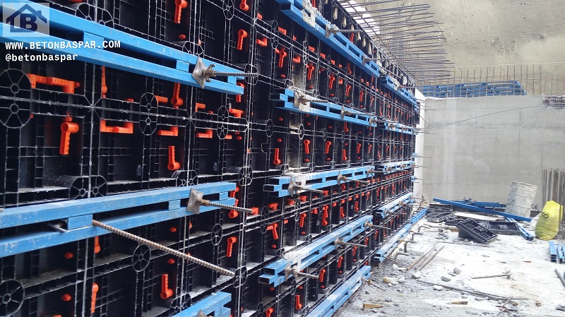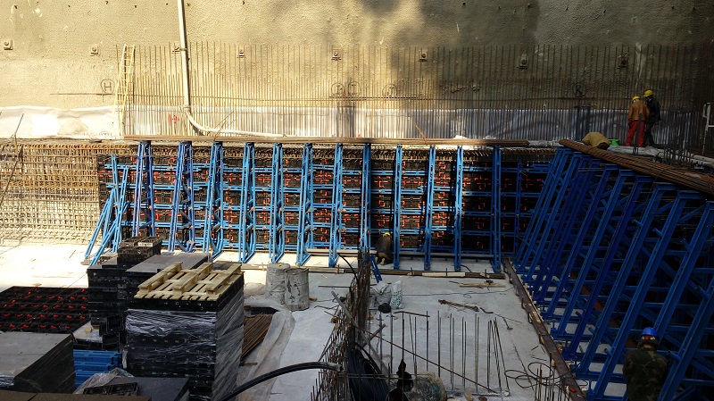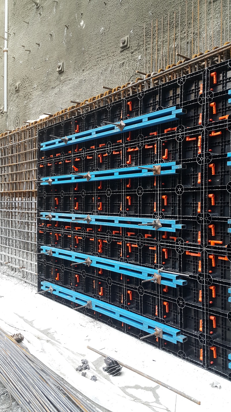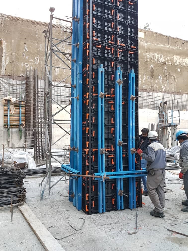 The thickness of retaining walls in Ajodanieh project ,as you can see on pictures, is around 70 cm and huge amount of concrete should be supported by shuttering with Beton Basoar Plastic Formwork system. out engineering team, suggested that using Truss-Steel frame at the back of plastic formworks to withstand and sustain hyrostatic pressure of 70 cm concrete of retaining walls with wall's height around 300 cm.