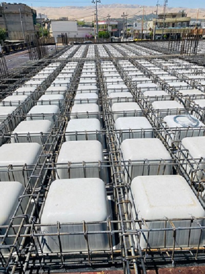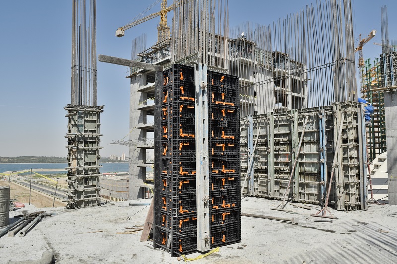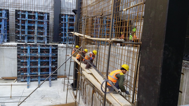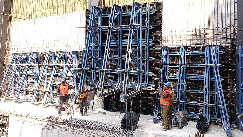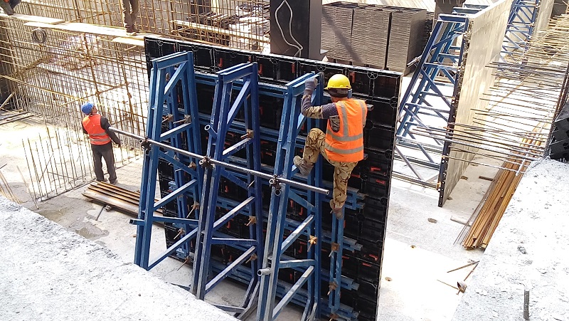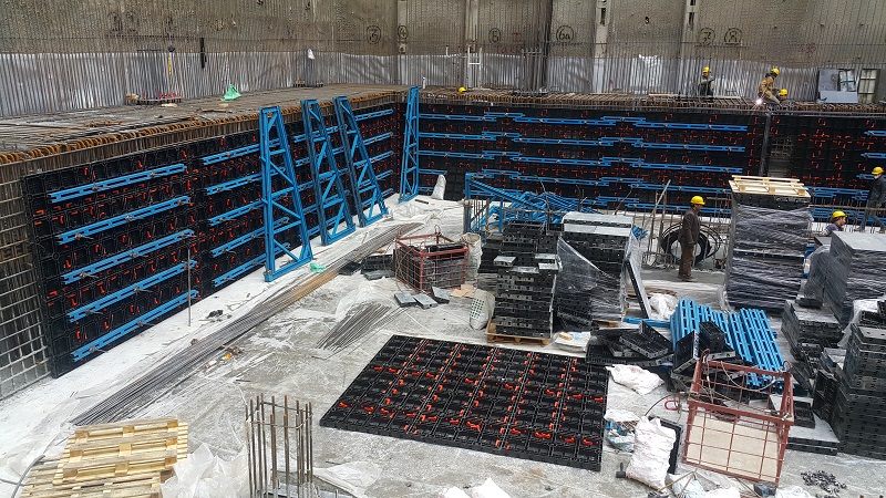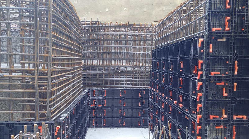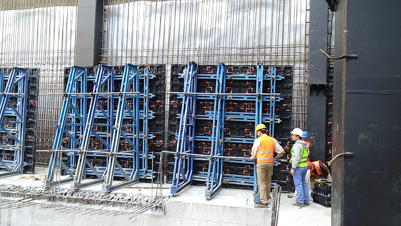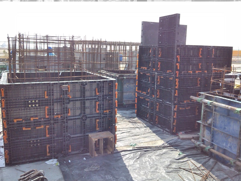 The thickness of retaining walls in Ajodanieh project ,as you can see on pictures, is around 70 cm and huge amount of concrete should be supported by shuttering with Beton Basoar Plastic Formwork system. out engineering team, suggested that using Truss-Steel frame at the back of plastic formworks to withstand and sustain hyrostatic pressure of 70 cm concrete of retaining walls with wall's height around 300 cm.